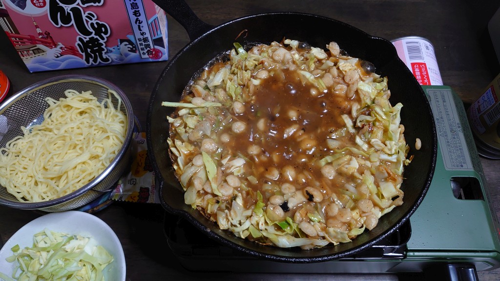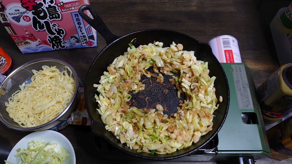 丁度キャベツも在庫してたしベーコンもあったので、一昨日届いたコンロ*1にスキレットで一人もんじゃ&鉄板開始(゚∀゚)