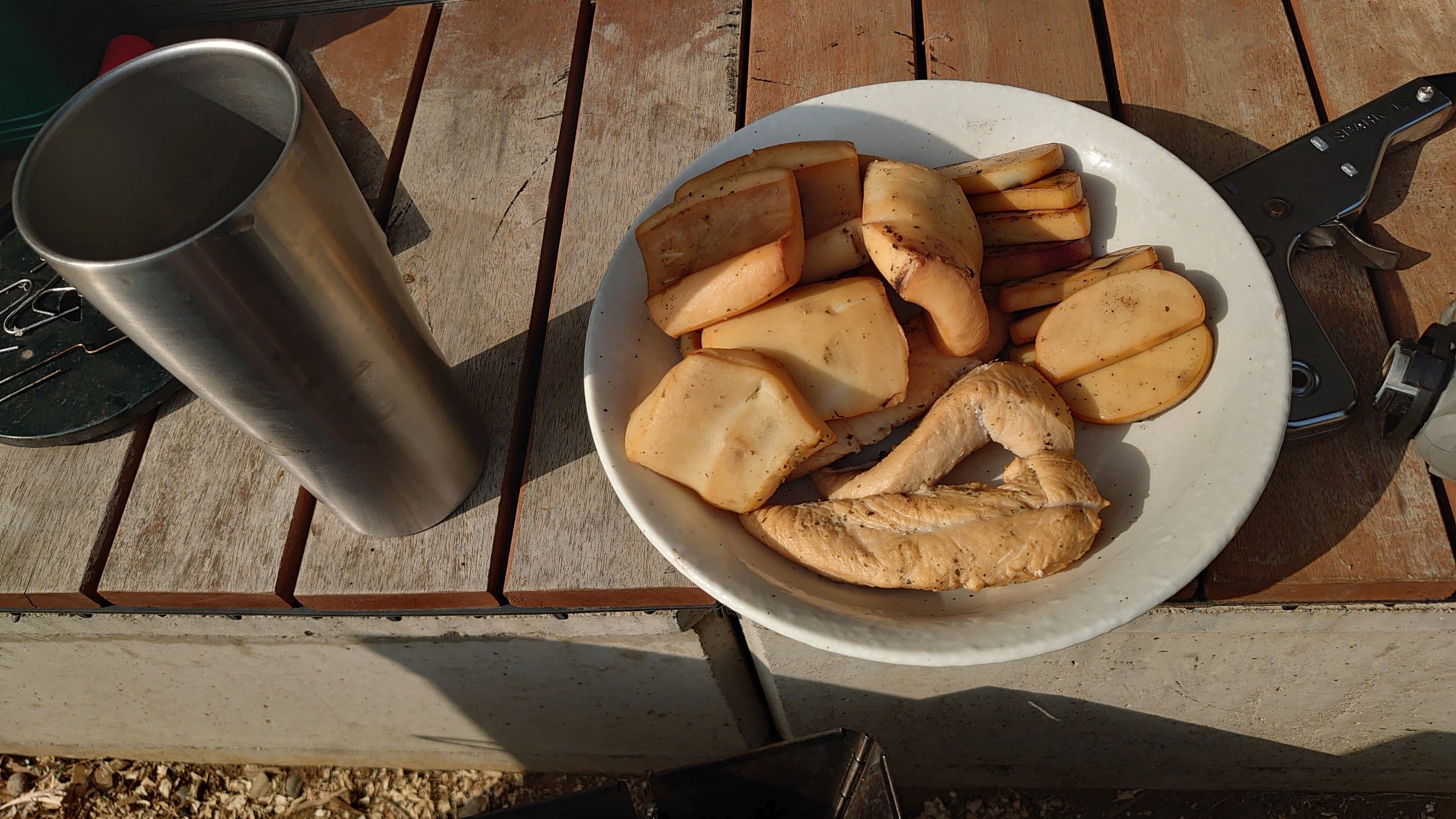 風の中頑張ったけど、火のおもりめんどいので肉は家の中で焼く。