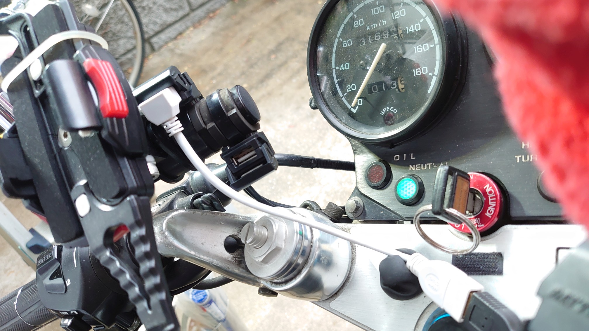 そうでなくてもスマホホルダと干渉して使いにくかったので、密林でアングルのUSB中継ケーブル調達したり、右ハンドルにも一口を追加したり。