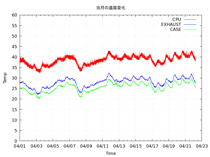 あと、I2Cから温度読み出して記録するツールも毎分起動なので、crontabに「sleep 15;/usr/local/etc/ほげほげ.plt」で遅延させないと結構な割合でエラーになるw