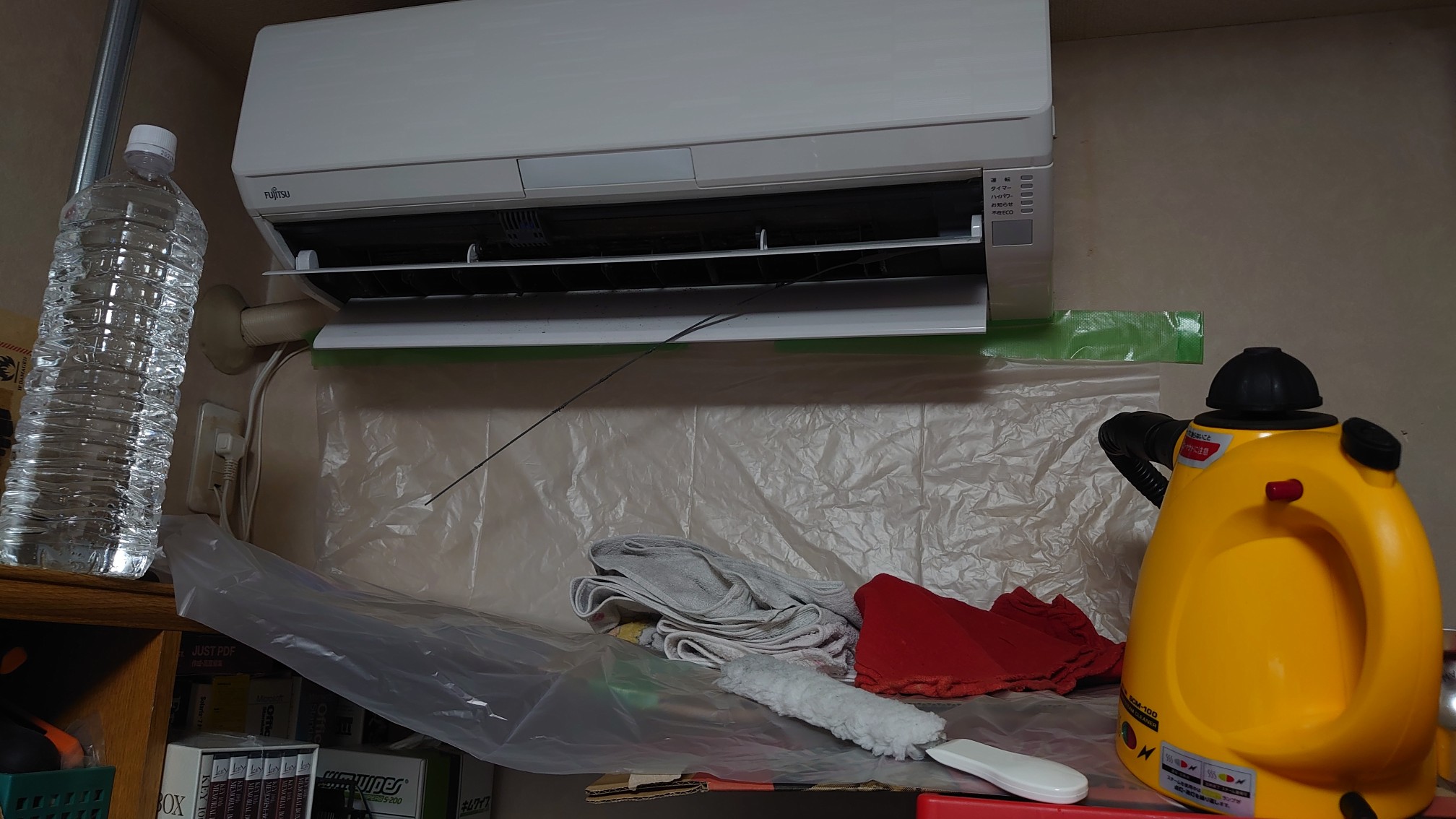 エアコンの下をビニール袋と養生テープで養生して開始。。。