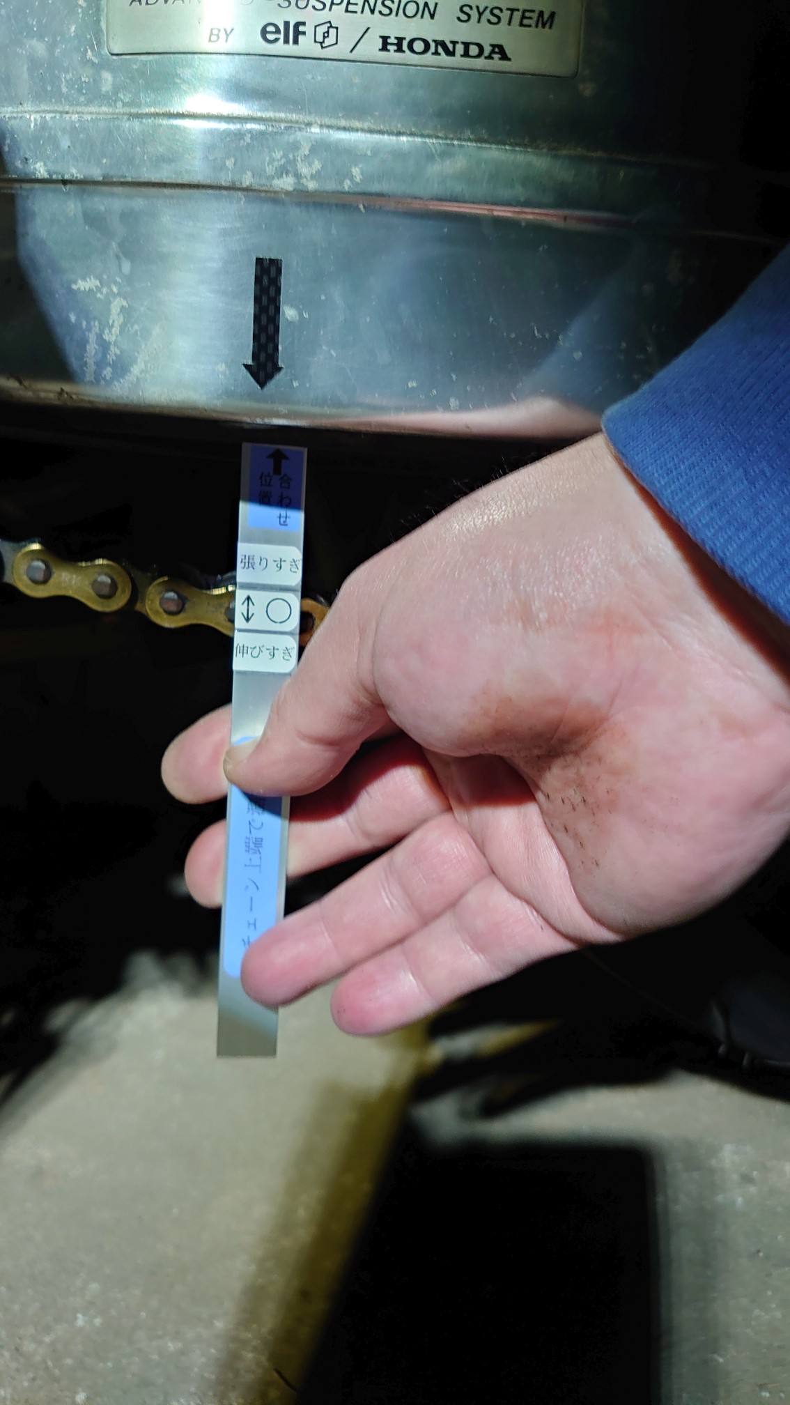 BROSのチェーン調整、車載工具のスパナのエクステンダーが物差しを兼ねてる。