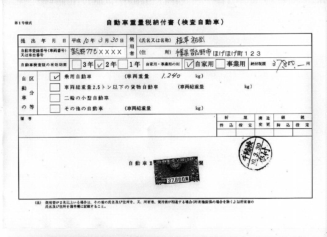 これは、通常ならば毎年4月終わりに来る自動車税の納付書の片割れ(「車検」と書いてあるもの)